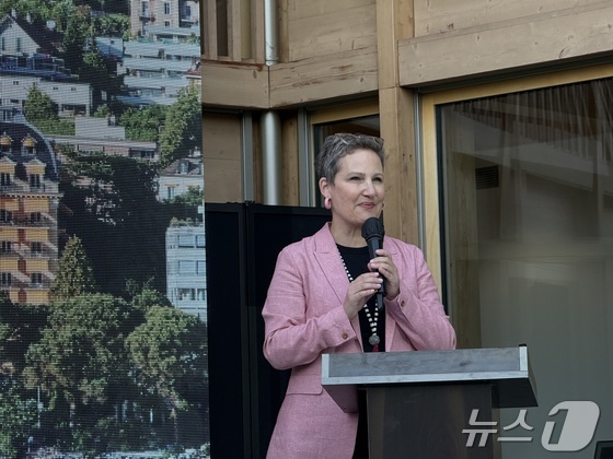 지난 24일 오후 서울 종로구 스위스대사관저에서 발표하고 있는 김지인 스위스관광청 한국지사장 © 뉴스1 윤슬빈 관광전문기자