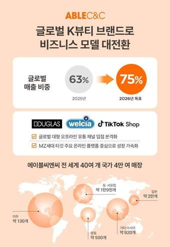 27일 금융감독원 전자공시 시스템에 따르면 에이블씨엔씨는 지난해 연결기준 매출 2420억 원과 영업이익 180억 원으로 4년 연속 흑자를 이어갔다. 전년 대비 매출액은 1.2% 늘고 영업이익은 1.3% 감소했지만, 수익성이 높은 해외 매출 비중이 지난해 1분기 48%에서 연말 기준 68%까지 확대되며 체질 개선을 달성했다는 평가다.