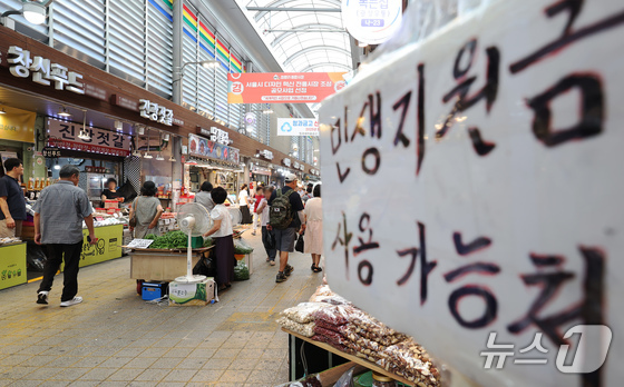 지난해 7월 서울 동대문구 청량리종합시장에 민생회복 소비쿠폰 사용가능 점포 안내문이 붙어 있다. 2025.7.25 © 뉴스1 장수영 기자