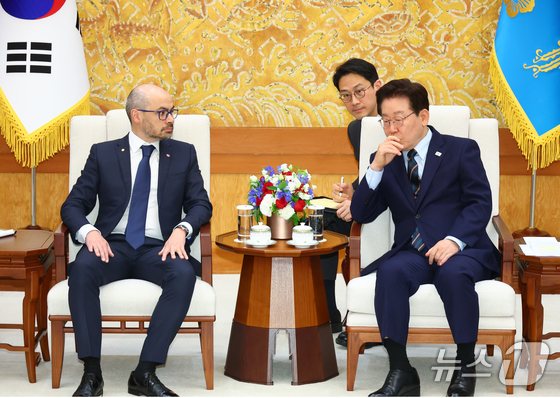 이재명 대통령이 27일 청와대에서 데미스 하사비스 구글 딥마인드 공동창업자 겸 대표와 대화하고 있다. (청와대통신사진기자단) 2026.4.27 © 뉴스1 허경 기자