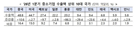 2026년 1분기 중소기업 수출액 상위 국가. (중기부 제공)