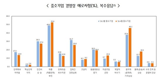 경영 애로 요인으로는 '매출 부진'이 52.6%로 가장 큰 비중을 차지했으며, 원자재 가격 상승(46.1%), 인건비 상승(27.4%), 업체 간 경쟁 심화(25.8%) 등이 뒤를 이었다.