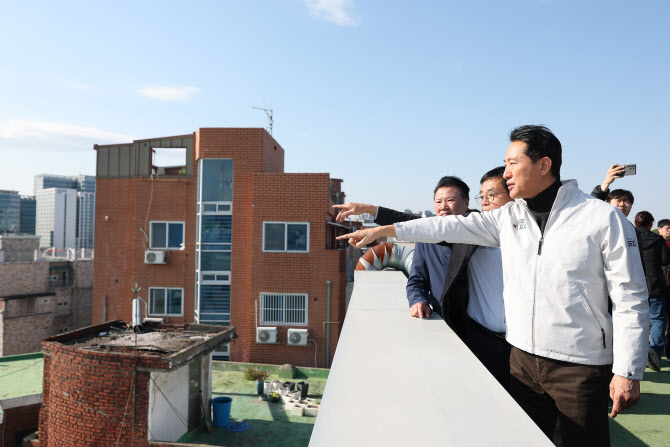 오세훈 서울시장이 지난달 28일 서울 구로구 가리봉동 한 건물 옥상에서 가리봉2구역 재개발 관련 설명을 듣고 있다. (사진=연합뉴스)