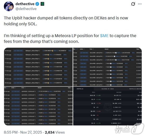 가상자산 데이터 분석 계정 '디텍티브(Detective)'도 X(구 트위터)를 통해 "업비트 해커가 모든 토큰을 덱스에서 덤핑(매도)했다. 해커는 이제 솔라나(SOL)만 들고 있다"고 밝혔다.