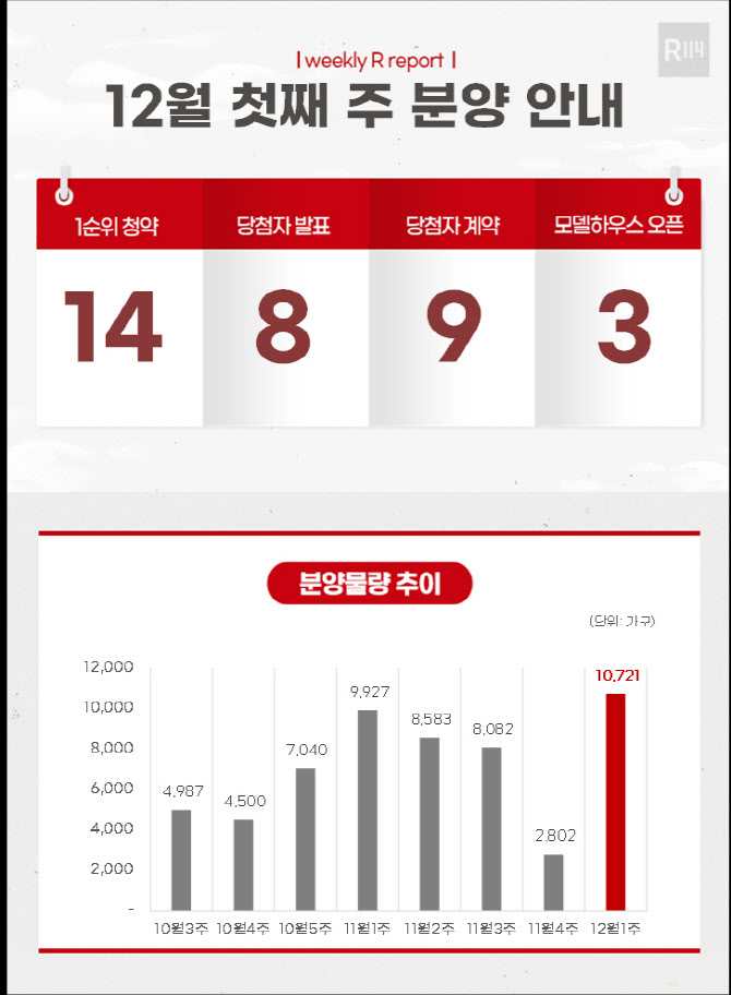 또한 12월 2일 △화성남양뉴타운우미린에듀하이(B16) 1순위 △엘리프세종스마트시티 1순위 △울산호수공원에일린의뜰 1순위 △두산위브더제니스센트럴천안 1순위 청약이 시작된다. 12월 3일에는 △안양자이헤리티온 1순위 △김포북변칸타빌디에디션 1순위 청약도 개시한다.