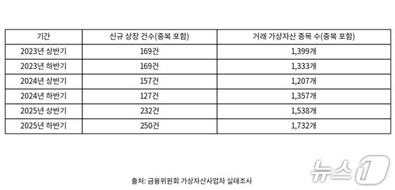 3일 금융위원회가 최근 발표한 2025년 하반기 가상자산사업자 실태조사에 따르면 지난해 하반기 가상자산 거래소 신규 상장 건수는 250건(중복 포함)으로, 상반기(232건) 대비 8% 증가했다.