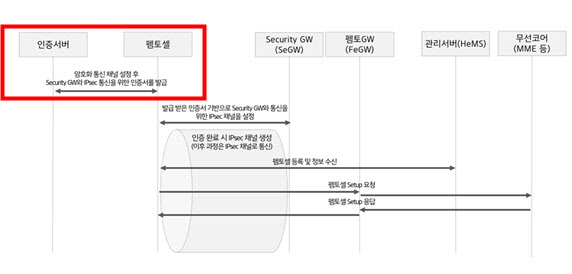 이 의원이 통신 3사로부터 받은 자료에 따르면 펨토셀 개통 과정은 ①인증서버 인증 → ②IPsec 통신용 인증서 발급 → ③펨토셀 게이트웨이 접속 순으로 동일하다.