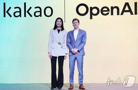 정신아 카카오 대표와 챗GPT 개발사 오픈AI의 샘 올트먼 최고경영자(CEO)가 4일 서울 중구 플라자호텔에서 열린 전략적 제휴 체결 공동 기자간담회에서 포즈를 취하고 있다. 2025.2.4/뉴스1 © News1 오대일 기자