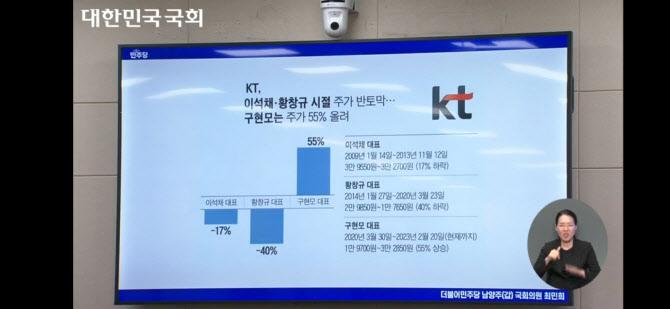 최 위원장은 “구현모 대표는 매출 25조 원 돌파, 주가 55% 상승이라는 성과를 냈음에도 두 차례 단독 후보로 뽑힌 뒤 낙마했다”며 “일 잘하는 사람을 내보낸 것은 용산 압박 때문 아니었나”라고 지적했다.
