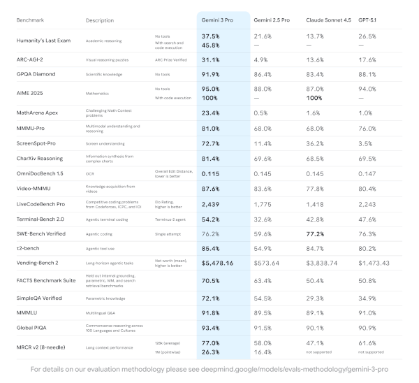 구글 관계자는 "제미나이3는 인공지능의 사고·추론 능력을 측정하는 벤치마크 '휴머니티스 라스트 이그잼'(Humanity’s Last Exam) 평가에서 37.4점을 기록했다"며 "현존 AI 모델 중 최고 점수로 GPT-5.1과 클로드 소넷 4.5를 포함한 경쟁 모델들을 앞선 수치"라고 말했다.