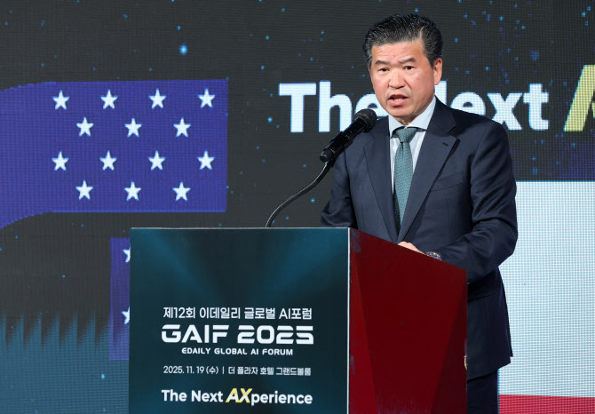 [이데일리 방인권 기자] 제임스 김 주한미국상공회의소(암참) 회장이 19일 서울 중구 더플라자 호텔에서 열린 ‘이데일리 글로벌 AI포럼(GAIF 2025)’에 참석해 축사를 하고 있다.