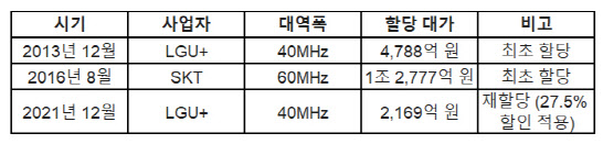 이번 갈등은 양사가 해당 대역을 확보할 때 지불했던 가격의 차이에서 비롯됐다. SKT는 2016년 경매에서 2.6㎓ 60㎒ 폭을 1조 2777억원(10년)에 낙찰받았다. 반면 LGU+는 2013년 경매에서 40Mhz를 4788억(8년)에 할당받은 후 2021년 재할당 당시에는 27.5% 할인율이 적용된 2169억원(5년)에 낙찰받았다. 2.6GHz 주파수 대가를 연간 기준으로 단순 비교하면 SKT는 MHz 당 연간 21억3000만원을 부담했고, LGU+는 MHz 당 연간 약 10억8000만원을 부담했다. 같은 대역을 사용함에도 금액 부담이 두 배 가까이 차이 나는 상황이다.