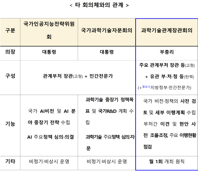 과학기술관계장관회의는 국가인공지능전략위원회나 국가과학기술자문회의와는 성격이 다르다. 두 기구가 비전과 중장기 전략을 심의·자문하는 최고 의사결정 구조라면, 장관회의는 그보다 앞단에서 부처 간 이견을 조정하고, 정책 실행을 실질적으로 점검·관리하는 기능을 담당한다.