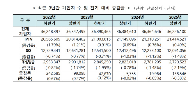 방송미디어통신위원회가 24일 발표한 ‘2025년 상반기 유료방송 가입자 수 및 시장점유율’에 따르면 IPTV·SO·위성방송을 합한 전체 유료방송 가입자는 3622만6100명으로 집계됐다.