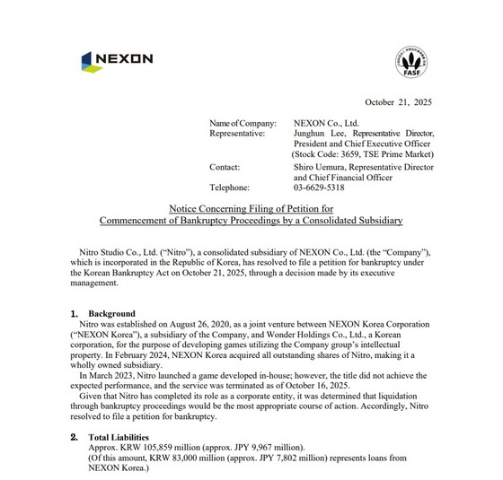 넥슨 일본 법인이 지난달 21일 니트로스튜디오 파산 신청을 결의했다고 공시했다.(넥슨재팬 웹사이트 갈무리)2025.11.24/뉴스1
