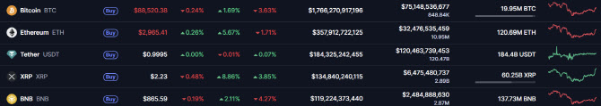 글로벌 가상자산 시황중계 사이트 코인마켓캡에 따르면 25일 오전 8시 30분 기준 비트코인 가격은 24시간 전 대비 1.69% 상승한 8만 8520달러를 기록했다. 일주일 전과 비교하면 3.63% 하락했다. 같은 시간 리플은 8.86% 상승한 2.23달러에, 이더리움은 전일 대비 5.67% 오른 2965달러에 거래됐다.