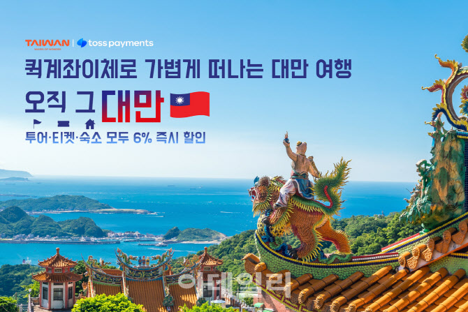 놀과 마이리얼트립에서 토스페이먼츠 퀵계좌이체로 5만원 이상 대만 여행상품을 결제하면 6%(최대 1만원)의 즉시 할인을 받을 수 있다. 투어, 티켓, 숙소 등 다양한 대만 관련 상품에 적용되며, 결제 시 자동으로 할인 혜택이 반영된다.