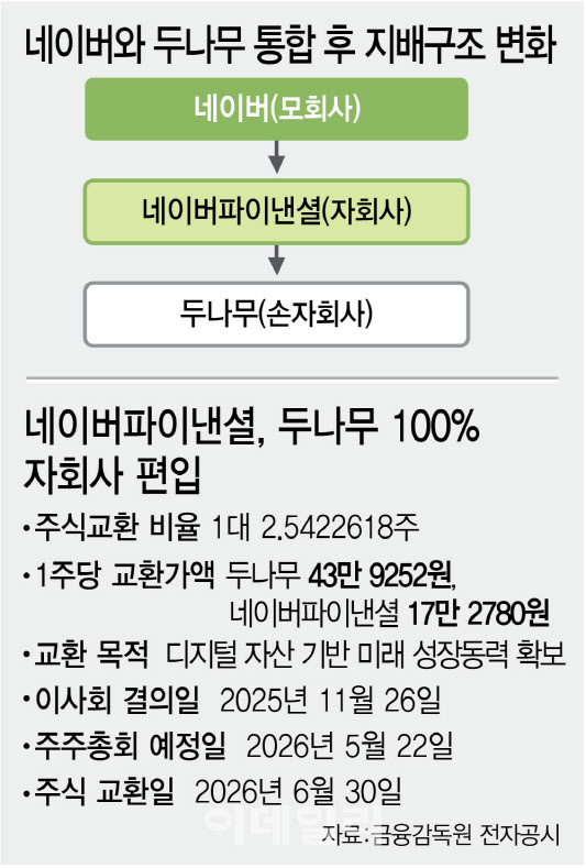 이사회 결정에 따라 두나무는 네이버파이낸셜의 100% 자회사, 이어서 네이버의 손자회사가 된다. 이 비율 적용으로 송치형 의장, 김형년 부회장 등 두나무 경영진은 통합 법인의 최대주주가 된다. 네이버는 “네이버파이낸셜의 완전 모회사가 되는 네이버는 두나무 경영진과의 주주간 계약을 통해 의결권을 확보해, 네이버파이낸셜을 연결 종속회사로 유지할 것”이라고 설명했다.