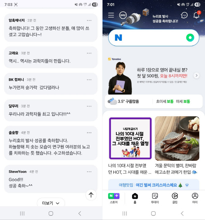 대형포털인 네이버와 다음은 메인 화면에 누리호 응원 메시지와 실시간 뉴스를 확인하도록 화면을 배치했다. 발사전 네이버는 ‘내일 새벽 누리호의 네 번째 도전’이라는 문구로 응원했고, 다음은 뉴스와 진행상황을 쉽게 확인하도록 했다. 발사뒤 네이버는 ‘누리호 발사 성공을 축하합니다’라고 화면을 띄웠다. 다음도 누리호 4차 발사 성공을 축하하는 응원 문구를 입력할 수 있는 창을 만들었다. 누리꾼들은 ‘우리나라 과학자들 최고다’, ‘대단한 여정의 완벽한 성공을 축하한다’ 등의 문구로 발사성공을 함께 축하했다.