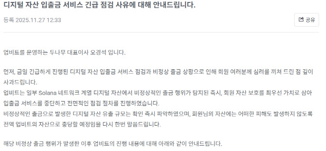 업비트는 27일 오경석 두나무 대표 명의 공지를 통해 “업비트는 27일 오전 4시42분께 솔라나(Solana) 네트워크 계열 가상자산 일부(약 540억원 상당)가 내부에서 지정하지 않은 지갑 주소(알수 없는 외부 지갑)으로 전송된 정황이 포착됐다”고 밝혔다.