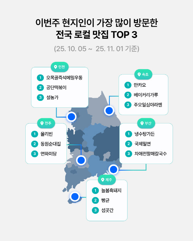 현지인 인기 데이터는 매주 갱신된다. 예컨대 속초에서는 관광객에게 유명한 ‘청초수물회 속초본점’보다 실제 현지인이 가장 많이 찾은 곳은 중식당 ‘만카오’로 나타나는 등 지역민의 소비 패턴을 그대로 반영한다.