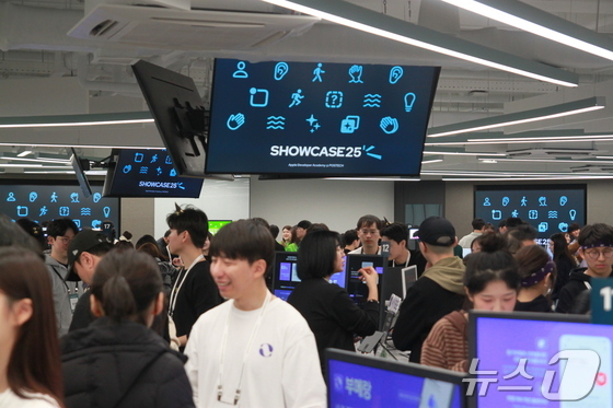 27일 오후 포항공과대학교(POSTECH)에 위치한 애플 디벨로퍼 아카데미가 애플리케이션(앱) 쇼케이스를 진행했다. 이날 오후 쇼케이스 행사 현장이 방문객으로 붐비고 있다.2025.11.27/뉴스1 © News1 김민재 기자