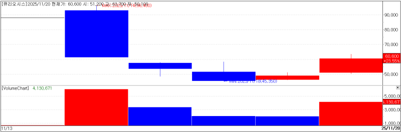 Curiosis closed at 60,600 won, up 11,550 won (23.55%), reclaiming the 60,000-won range after four days.