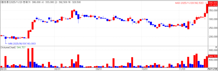 이날 KG제로인 엠피닥터(MP DORTOR·옛 마켓포인트)에 따르면 펩트론은 전일 대비 4만9500원(14.8%) 오른 38만4000원에 장을 마쳤다. 이날 펩트론은 장 중 한 때 39만2500원으로 52주 최고가를 기록했다.