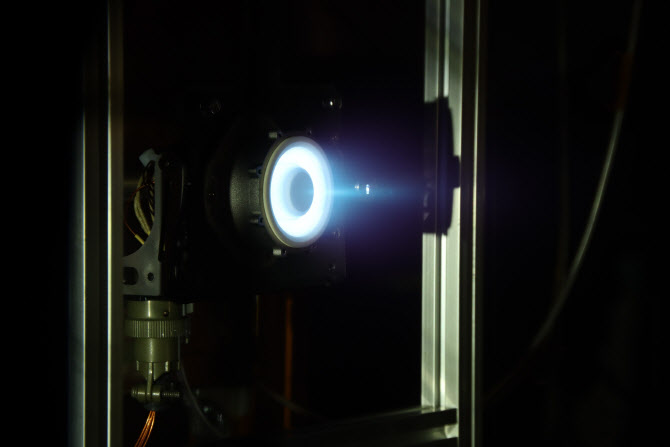 K-HERO 임무 경험 기반으로 최원호 교수 연구팀 창업기업 코스모비가 개발 중인 150W급 초소형 홀추력기 지상 우주환경 모사 진공챔버 작동 장면.(사진=KAIST)
