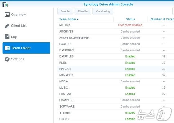 시놀로지 드라이브(Synology Drive) 팀 폴더 관리 화면