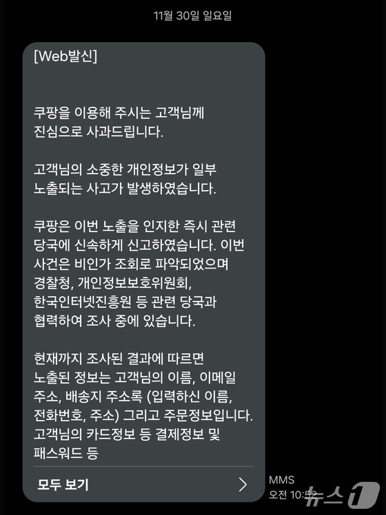 쿠팡이 개인정보 유출 사고를 처음 알린지 하루 뒤인 30일에야 도착한 개인정보 유출 고지 문자 안내 ⓒ뉴스1 김정현 기자