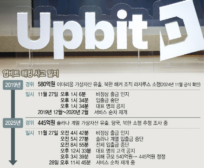 업비트가 수백억 원 규모의 해킹을 당한 것은 2019년 이후 6년 만이다. 당시에도 이더리움 34만여 개(약 580억원)가 유출됐으며, 북한 정찰총국 산하 해킹 조직이 배후로 지목된 바 있어 이번 사건 역시 북한 소행 가능성이 조사되고 있다.