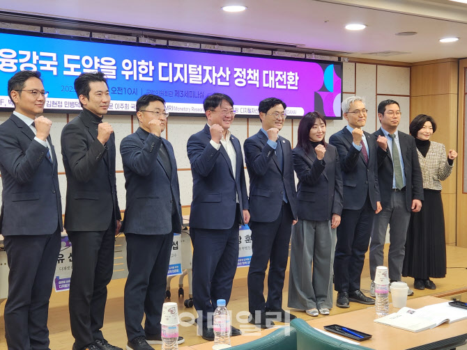 3일 더불어민주당 디지털자산TF가 국회의원회관 제3세미나실에서 개최한 ‘글로벌 금융강국 도약을 위한 디지털 자산 정책 대전환’ 토론회 참석자들이 기념사진을 촬영하고 있다. (사진=안유리 기자)