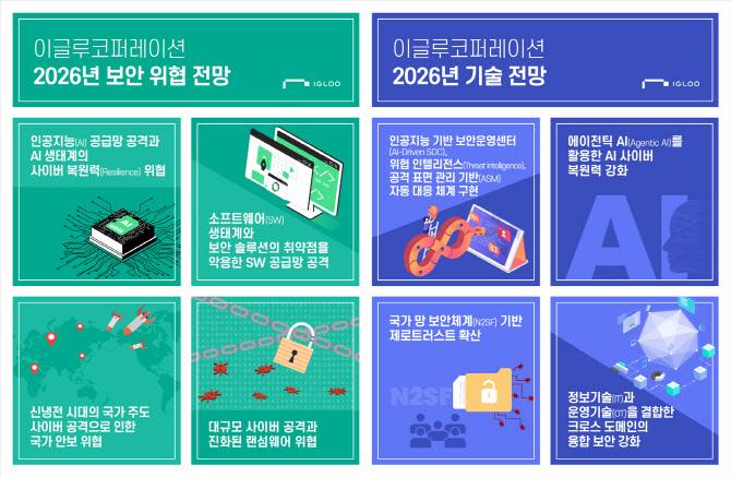 이글루코퍼레이션은 이 밖에도 △다수의 AI 에이전트가 협력해 문제를 해결하는 ‘에이전틱 AI’ △‘국 망보안체계(N2SF)’ 기반의 제로 트러스트 구현 △정보기술(IT)과 운영기술(OT)을 아우르는 크로스 도메인 융합 보안 강화를 중점 과제로 제시했다.