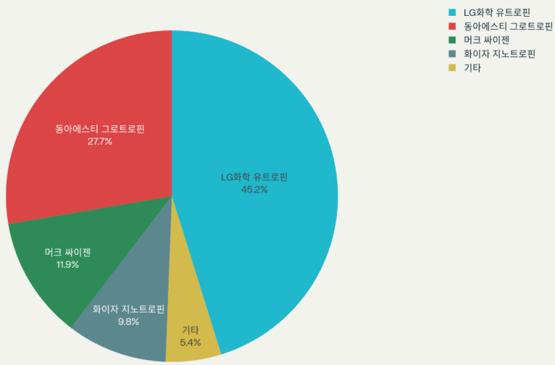 LG화학과 동아에스티, 두 기업의 점유율은 판매량 기준 70.5%(LG화학 45%, 동아에스티 28%)를 넘어섰다. 글로벌 제약사인 화이자 지노트로핀의 시장 점유율은 2019년까지 21%로 2위였지만 9%로 추락했다.