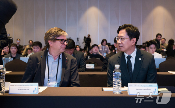 배경훈 부총리 겸 과학기술정보통신부 장관이 27일 오전 서울 용산구 드래곤시티호텔에서 열린 'AI 프론티어 국제 심포지엄 2025' 에 참석해 얀 르쿤 뉴욕대 교수와 대화를 나누고 있다. (과학기술정보통신부 제공. 재판매 및 DB 금지) 2025.10.27/뉴스1