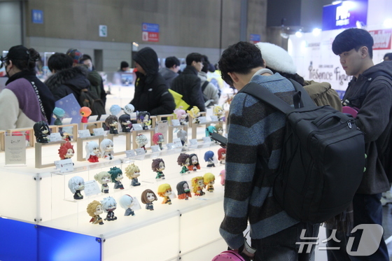 5일 오전 서브컬처 페스티벌 'AGF 2025'가 열리는 일산 킨텍스 제 1전시장에서 방문객이 기념품을 고르고 있다. AGF 2025는 12월 5일부터 7일까지 일산 킨텍스에서 열린다.2025.12.5/뉴스1 © News1 김민재 기자
