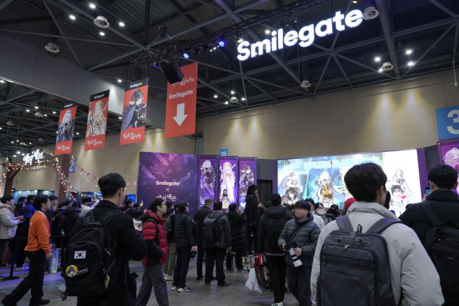5일 일산 킨텍스에서 열린 애니 게임 전시회 ‘AGF 2025’에서 스마일게이트가 메인 스폰서로 참여한 가운데, 부스에 관람객이 붐비고 있다. (사진=스마일게이트)