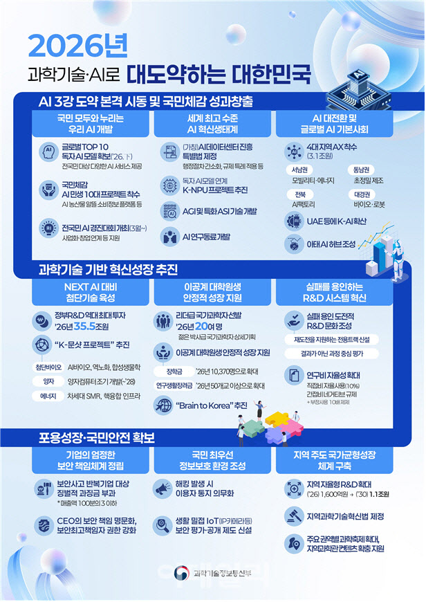 우리 AI 개발·보급을 위해 추진 중인 ‘독자AI파운데이션 모델 프로젝트’ 1차 개발을 2026년 1월 중 완료해 상반기 내 오픈소스로 제공할 방침이다. 내년 세계 Top 10 수준 진입을 목표로 한다. 독자AI모델 기반 국방·제조·문화 등 다양한 특화 서비스를 개발하고 AI민생 프로젝트 등을 통해 우리 AI를 모두가 누릴 수 있도록 제공한다.