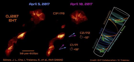 이번에는 5일 간격으로 두 번을 관측, OJ287의 제트 구조와 편광각(빛의 진동 방향)이 변하는 것을 확인했다. 제트 플라스마와 주변 매질 사이의 속도 차이로 인해 발생하는 불안정성이 제트 내부 충격파와 상호작용하며 발생한 결과다.