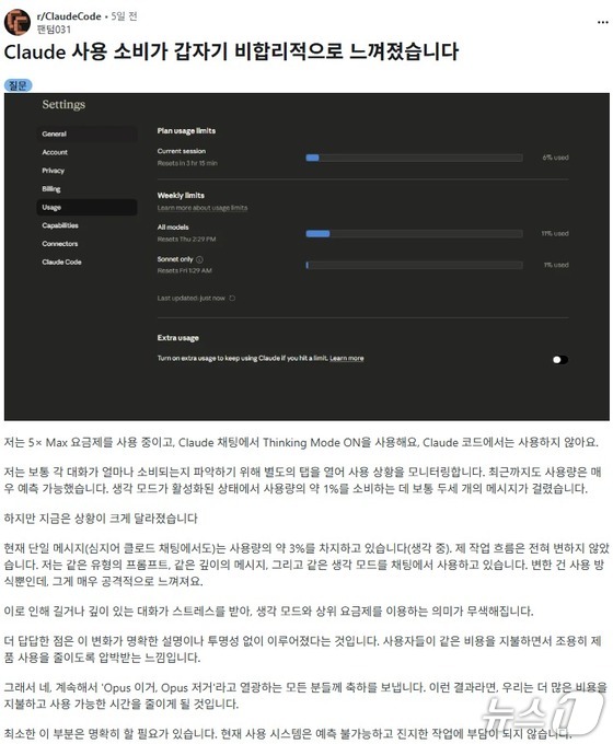 맥스 5배 플랜(월 100달러)을 구독 중이라는 이용자는 "1일 이후 이전과 같은 작업에도 토큰 소비가 급격히 증가했다"며 "기존에 4~5시간 지속되던 토큰이 지금은 1시간 내 소진된다"고 주장했다.