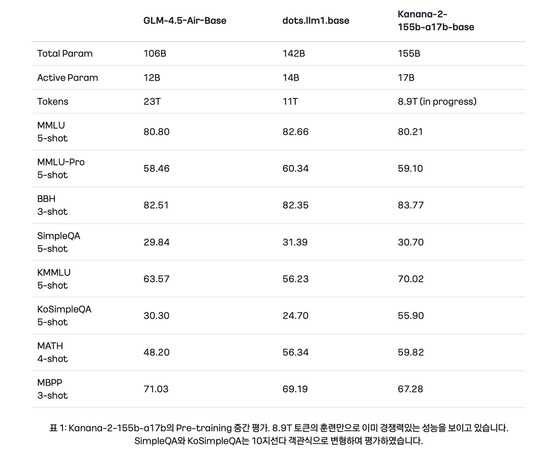 한편 카카오는 현재 MoE 구조를 기반으로 거대 스케일의 수천억 파라미터 모델 '카나나-2-155b-a17b'(Kanana-2-155b-a17b) 개발을 위한 학습을 진행 중이다.