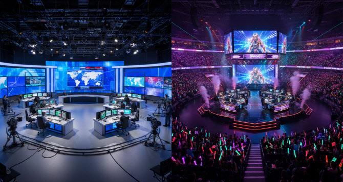 CJ올리브네트웍스, 방송미디어 IT서비스 사업 잇따른 수주로 경쟁력 입증 (방송국 스튜디오 및 e스포츠 경기장 전경을 AI로 생성한 이미지