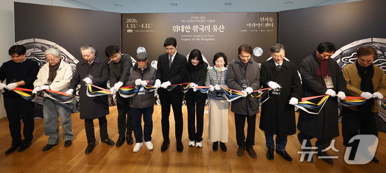 조길현 데브시스터즈 대표(왼쪽 여섯번째)가 22일 서울 종로구 아라아트센터에서 열린 '쿠키런: 킹덤 아트 콜라보 프로젝트 특별전 - 위대한 왕국의 유산' 언론공개회에서 참여작가들과 테이프 커팅식을 하고 있다. 이번 특별전은 데브시스터즈가 지난 2년간 이어 온 아트 콜라보 프로젝트를 총망라한 전시로 오는 23일부터 4월 12일까지 개최된다. 2026.1.22/뉴스1 © News1 최지환 기자