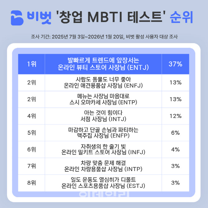한편 성향에 따라 간단하게 창업 가능성을 가늠해볼 수 있는 ‘창업 MBTI 테스트’는 비벗 앱을 통해 체험할 수 있다. NHN KCP가 운영하는 온·오프라인 창업 플랫폼 ‘비벗’은 지난해 3월 출시 이후 누적 앱 다운로드 수 약 6만 건, 누적 회원 수 약 3만 명(2026년 1월 기준)을 기록하고 있다.