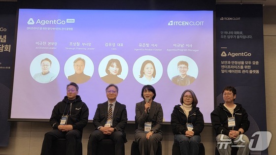 김우성 아이티센클로잇 대표, 유은빛 아이티센글로벌 에이전트고 프로덕트 오너 이사, 조상철 아이티센클로잇 부사장, 이규남 아이티센클로잇 에이전트고 프로그램 매니저 이사, 이균진 아이티센클로잇 AX 디비전 리더 본부장이 질의에 답변하고 있다. 2026.1.27 뉴스1 © News1 김민석 기자