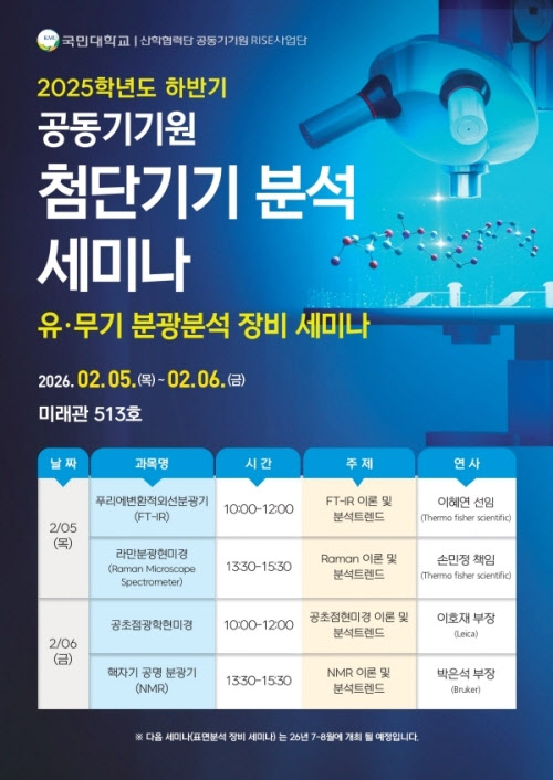 이번 세미나는 연구 장비 활용에 관심 있는 누구나 신청 가능하며, 참가비는 전액 무료다. 교육 이수자에게는 국민대 공동기기원장 명의의 수료증이 수여된다. 신청 및 세부 일정은 국민대 공동기기원 홈페이지에서 확인할 수 있다.