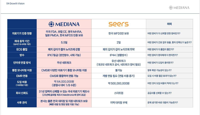 메디아나가 8일 기업설명회에서 발표한 씨어스테크놀로지와의 비교표 (자료=메디아나)