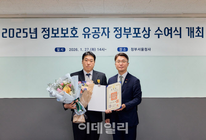 토스 지정호 CISO(왼쪽)가 정보보호 유공 ‘국민포장’을 수상한 뒤 류제명 과기정통부 2차관과 기념촬영을 하고 있다. (사진=토스)