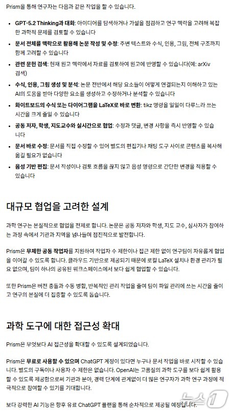 그러나 프리즘은 최신 GPT-5.2 모델을 기본 탑재하고 대규모 협업 툴도 부분 유료 없이 무료로 서비스한다.